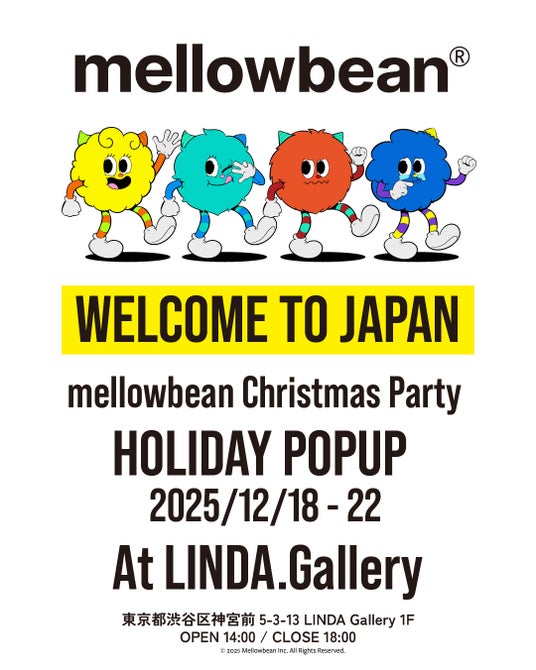 このたび、日本初のお披露目となるポップアップイベント「mellowbean Christmas Party」をホリデーシーズンに開催いたします。キャラクターの世界観をクリスマス仕様で表現したフォトスポットや、韓国で話題の人気商品も登場予定。日本のみなさまにいち早くmellowbeanの世界を体験いただける特別なイベントとなります。