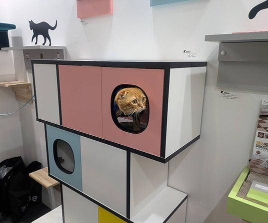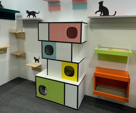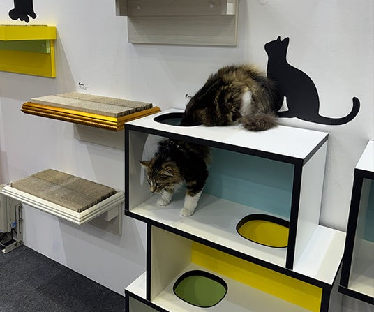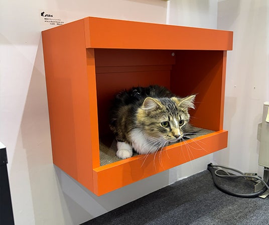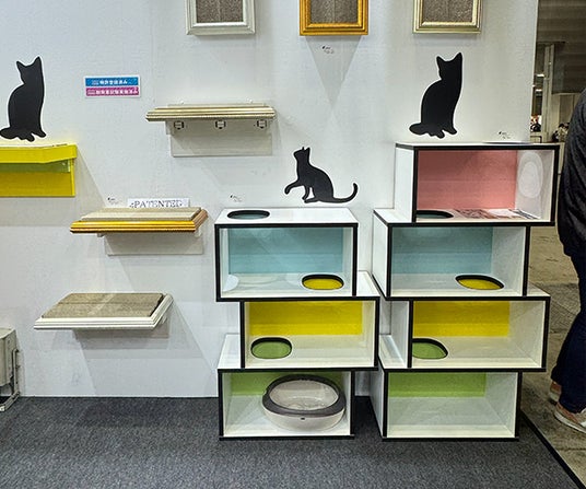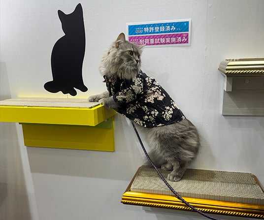 また、特許取得の技術を用いたキャットウォークや爪とぎラックの展示では、耐震試験をクリアした安全性の高さに加え、壁を傷つけにくく賃貸住宅でも設置できる取り入れやすさが注目されました。
