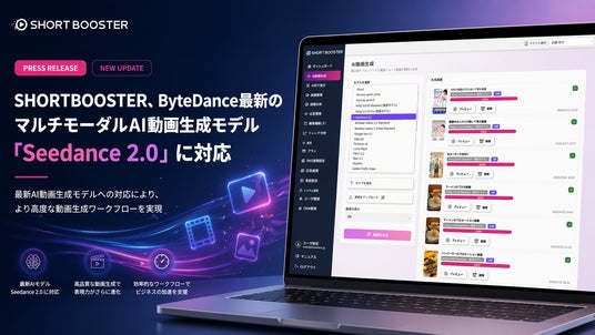 BOOSTTECH株式会社(本社:東京都新宿区、代表取締役 武藤 尭行/以下、当社)が提供するAI搭載の縦型ショート動画運用ツール「SHORTBOOSTER(ショートブースター)」は、本日2026年4月29日より、ByteDance社が開発する最新のマルチモーダルAI動画生成モデル 「Seedance 2.0」 に新たに対応いたしましたことをお知らせいたします。
