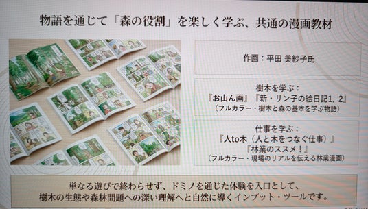 漫画家・平田美紗子氏による描き下ろし漫画(『お山ん画』『人と木』等)を同梱。ドミノ遊びを入口に、樹木の生態や林業のリアルな現場について自然に理解を深めます。
