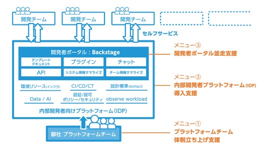 パブリッククラウド、コンテナ、IaC、CI/CD、Observabilityなどのクラウドネイティブ技術/アーキテクチャーや、AIも含めた専門性の高い関連DevOpsツールを利用し、チーム開発を高速化する内部開発者向けプラットフォーム(IDP)の設計構築を支援します。メニュー3. 開発者ポータル並走支援 1ヶ月~ 価格要相談