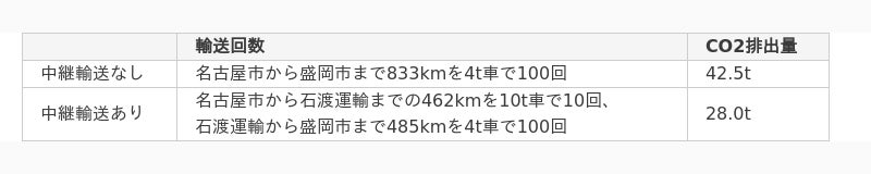 中継輸送あり:名古屋市から石渡運輸までの462kmを10t車で10回、石渡運輸から盛岡市まで485kmを4t車で100回輸送したと仮定