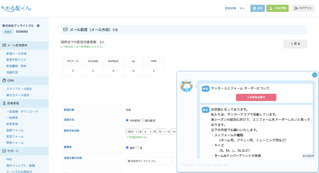 株式会社ディライトフル(東京都江東区)は、20年の運営実績と2000社以上の導入実績を持つメール配信SaaS「める配くん」に、ChatGPTによるメール本文提案機能をβ版で追加しました。業界最安レベルの価格で、一斉配信やHTMLエディタ、ターゲット配信、配信解析機能などが利用可能です。