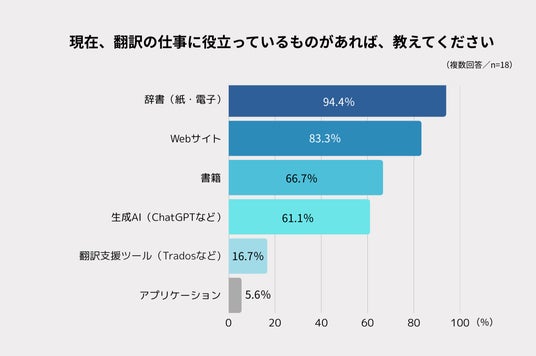 辞書・Webサイトといった「定番ツール」の利用は圧倒的ですが、注目すべきは生成AIの利用率が6割を超えたことです。回答の中には使用目的までは明記されていないものの、翻訳学習や表現検討の場で少しずつ取り入れられていることがうかがえます。