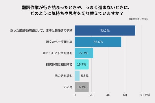 翻訳学習には必ずといってよいほど「手が止まる」「自信が持てない」といった行き詰まりやモチベーションが低下する局面があります。アンケートでは、そうした“壁”をどう乗り越えてきたかを尋ねました。(複数回答可)。