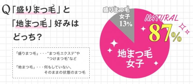 そして、長いまつ毛を手に入れるのに近道なのが、まつ毛エクステやつけまつ毛です。しかし、まつ毛エクステやつけまつ毛を使った「盛りまつ毛」と、何もしていない状態の「地まつ毛」を比較し、どちらを支持するかを男性たちに聞いたところ、「盛りまつ毛」派が13%、「地まつ毛」が87%という結果に。「盛りまつ毛」派:「地まつ毛」派は1:9となり、「地まつ毛」派の圧勝となりました。