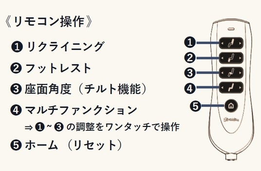 操作性:指一本で直感操作。電動3モーターが背もたれ・シート・フットレストを独立調整。右ひじの下にリモコン設置