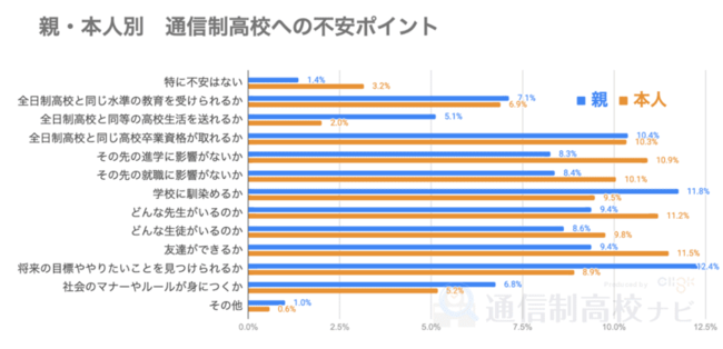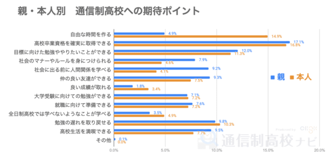 非常に多くの回答を集めたのが「高校卒業資格を確実に取得できる (親17.1%、本人16.8%)」で、こちらは親子ともに一番大きな割合を占める回答となりました。