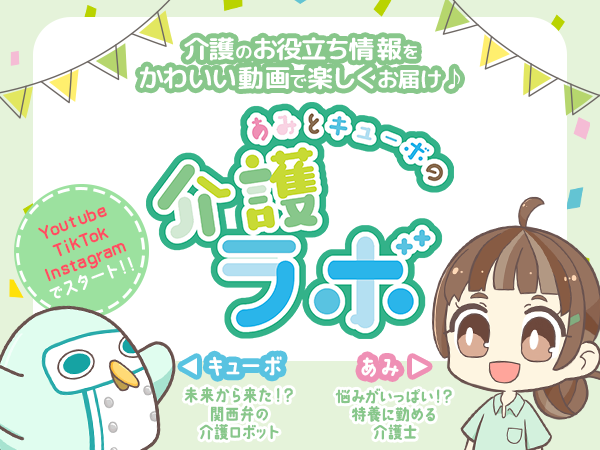 特別養護老人ホームに勤務する悩める介護士「あみ」と、未来からやってきた介護ロボット「キューボ」が、介護業界のあるあるやためになるお役立ち情報を発信。