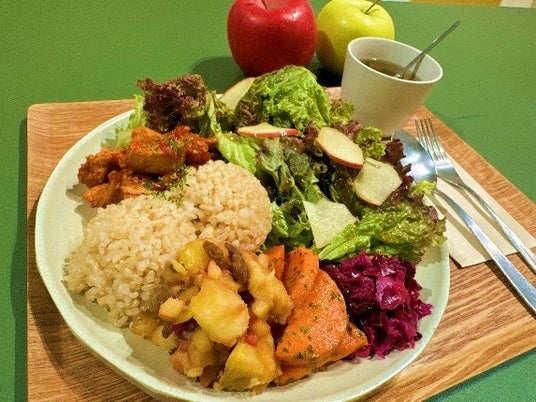 当店の一番人気ランチプレートのデリの1種として、11月限定で提供する「りんごとマッシュサツマイモのグラッセ」は、りんごの酸味とサツマイモの甘さがマッチしており、秋の味覚をお楽しみいただけます。サラダにはりんごスライスをトッピングし、フルーツサラダ風に仕上げました。サツマイモ&りんごで食物繊維がたっぷり摂れるプレートとなっています。