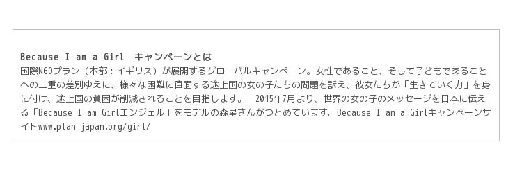 当日は、モデルの森星さんが「Because I am a Girlエンジェル」として登壇の予定です。