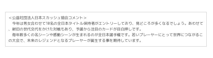 本大会は、2015 年の日本チャンピオンを決定する国内最高峰の大会であり、全国のスカッシュ選手愛好者の協力を結集して行う、一年間の中でも最大のイベントです。