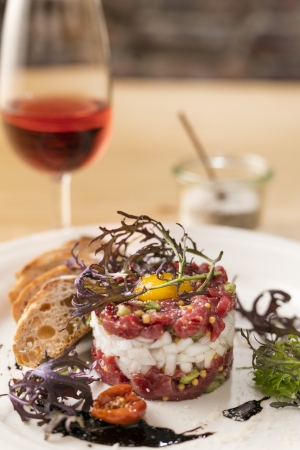 ・馬肉と新玉ねぎのタルタルステーキ、オレンジオイルと熟成バルサミコソース