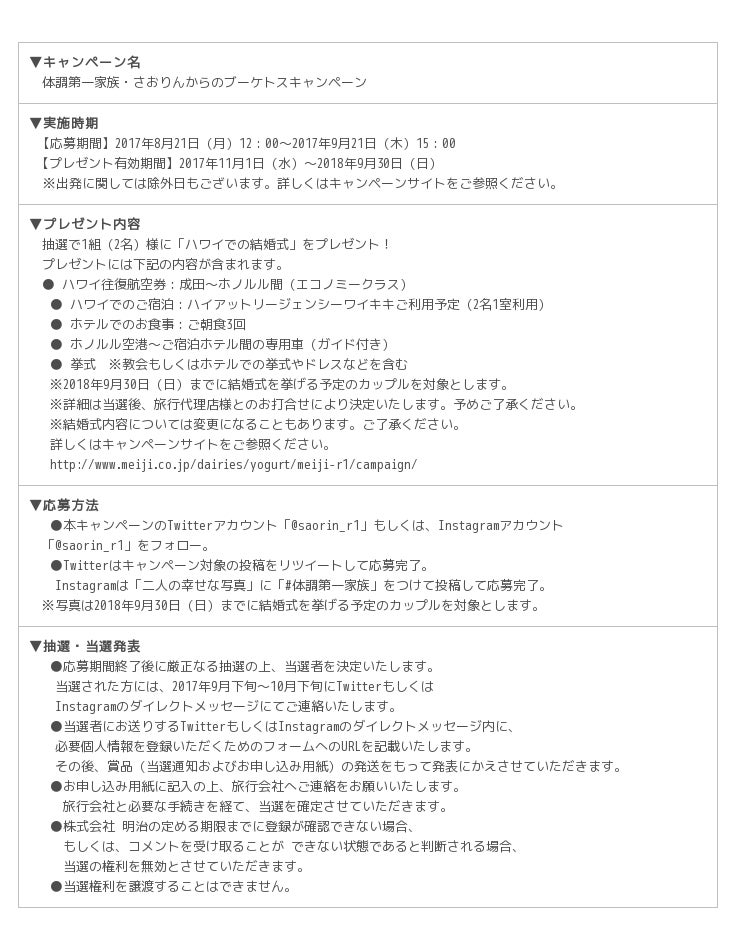 株式会社 明治(本社:東京都中央区、代表取締役社長:川村 和夫)は、先月より放映開始した「明治プロビオヨーグルトR-1」の新TVCMシリーズ「体調第一家族」のご好評にお応えして、本日8月21日(月)より『体調第一家族・さおりんからのブーケトスキャンペーン』を開始いたします。