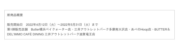Butter横浜ベイクォーター店・三井アウトレットパーク多摩南大沢店・BUTTER&DEL’IMMO CAFÉ DINING 三井アウトレットパーク滋賀竜王店