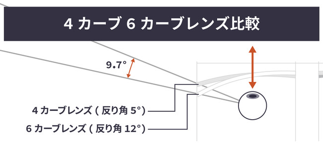 通常のメガネに使われる事が多い4カーブと今回のフレームで採用した6カーブを比較した時にサイドからの視界に約10°の差が生まれます。