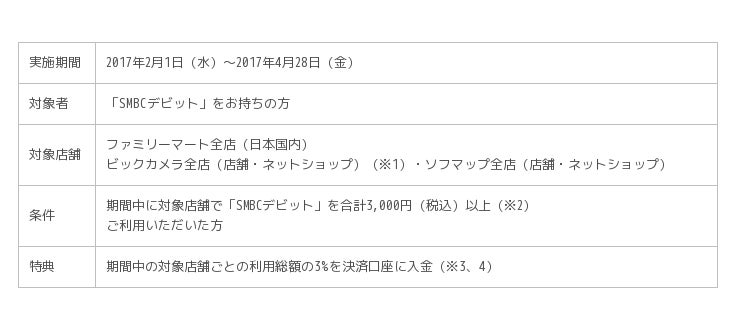 2017年2月1日より、SMBCデビットをファミリーマートまたはビックカメラ・ソフマップ(含むネットショップ)の全店で合計3,000円以上ご利用いただくと、対象期間中の対象店舗ごとの利用総額の3%分をもれなくプレゼントするキャンペーンを実施いたします。