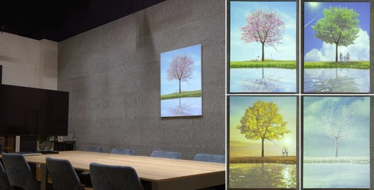 四季のうつろいを感じる不思議なコンテンツのパッケージです。 A0サイズのキャンバスには枝だけの1本の木が描かれています。プロジェクションマッピングを追加すると、春は桜、夏は新緑、秋は紅葉といったように様々な表情を見せてくれるコンテンツです。殺風景な応接室や会議室といった空間を、ワンポイントで彩ることができます。