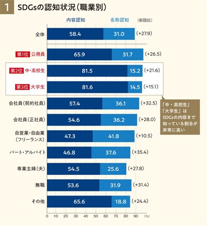 特に「公務員」(97.6%)、「中・高校生」(96.7%)、「大学生」(96.1%)でかなり認知が広がっている。