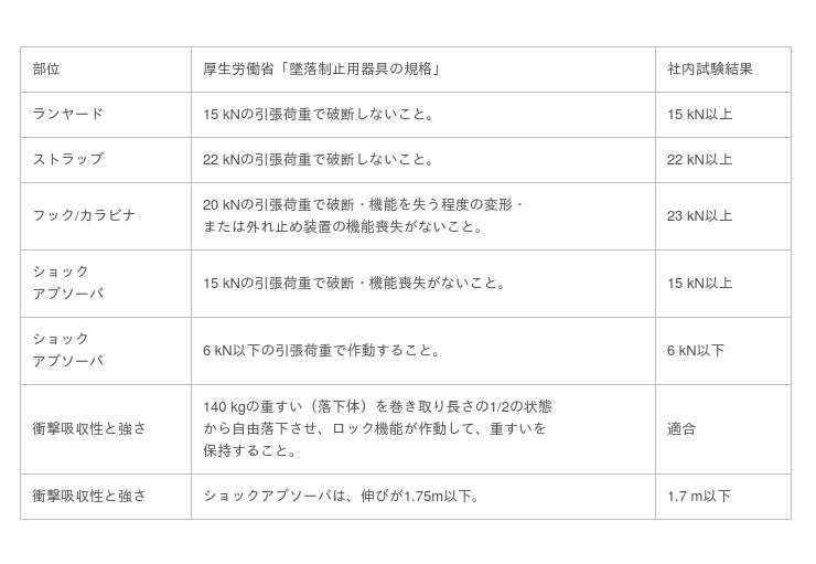 タイプ1 規格要求値 フック類11.5 kN 以上/ストラップ15 kN 以上)