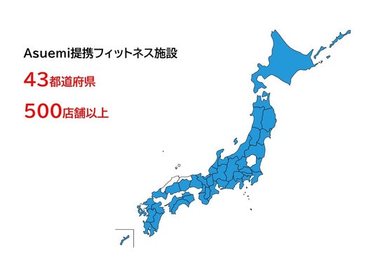 健康を広める仕組みを世の中に提案する株式会社アスエミ(本社:東京都港区、代表:大塚 貴一 以下「アスエミ」)が運営するフィットネスWEBプラットフォームサービス「Asuemi」は、掲載する提携フィットネス施設が500店舗(43都道府県)を突破いたしました。これからも日本全国47都道府県に提携店を拡大し、多くの方へ運動機会を提供するフィットネスネットワークを拡充して参ります。
