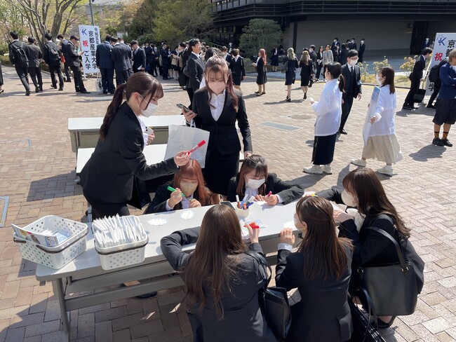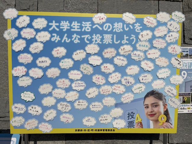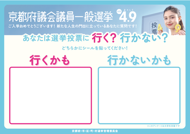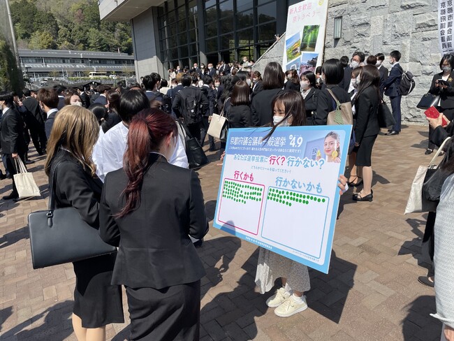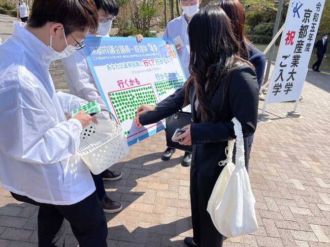 京都府選挙管理委員会は、京都の3つの大学の入学式会場にて、新入生を対象に、京都府議会議員選挙を含む統一地方選挙2023の、投票へ「行くかも」「行かないかも」のどちらかを選ぶ、アンケート調査を実施しました。
