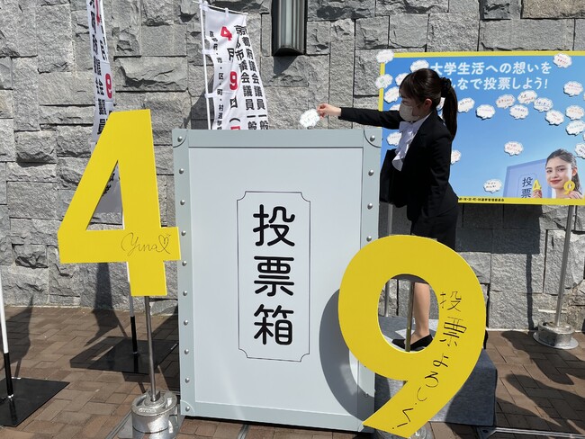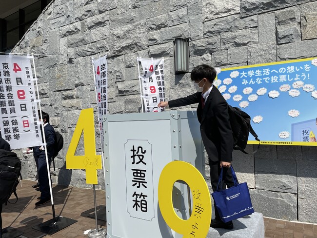 また、京都産業大学で行った調査の際には、京都府議選のCMやポスターなどにも使用されている巨大投票箱を、キャンパス内に設置。新入生に大学生活への想いを「投票カード」に記入してもらい、実際に巨大投票箱の中に投票する、という企画を実施しました。政治や選挙を身近に感じられる体験イベントを通して、新入生の方々に4月9日(日)の京都府議選への投票を促し、若年層の投票率向上を目指します。
