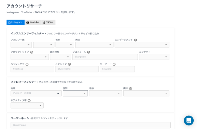 A streamに搭載している「アカウントリサーチ機能」では必要なインフルエンサーのセグメントをフィルターを使って瞬時に検索することができます。