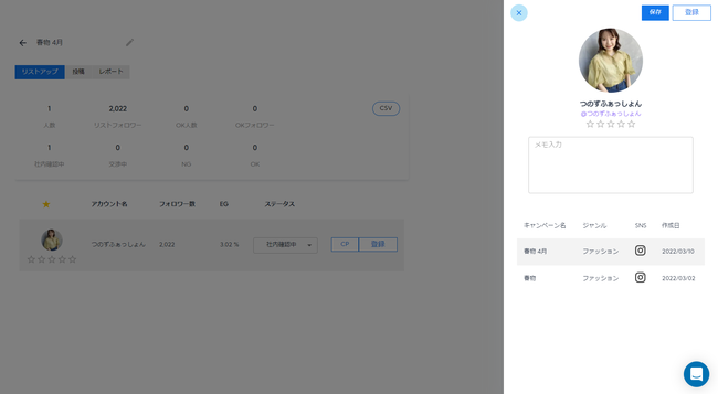 また、それぞれのインフルエンサ―にメモを入力して、あとからフリーワードで検索をかけることも可能です。そしてインフルエンサーが「過去にどの案件でリストアップされたか」なども一目で分かるようになっています。