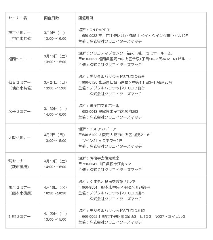 2018年は、9地域でセミナーを開催しましたが、2019年は規模を拡大し、2018年実施の9地域に加え、15地域(合計24地域)で開催を予定しています。また、2018年好評だった「無料で学べる動画カリキュラム」「クリエイティブコンテスト」も継続して実施していきます。