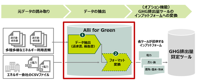 また、抽出したデータをGHG排出量算定ツールに連携し易くするサービスも三井住友銀行とAllganizeで共同開発致しました。排出量算定ツールが指定するデータアップロード用のテンプレートに自動でフォーマット転換されるサービスであり、データ整備の省力化を図ることが可能となります。