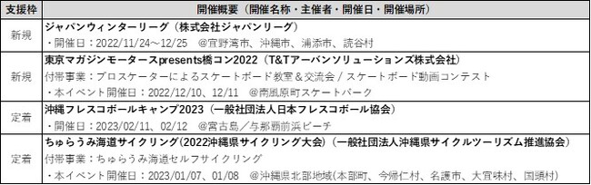 昨年度は、ブラジル発祥のビーチスポーツ「沖縄フレスコボールキャンプ(2023)」(定着)や「ジャパンウィンターリーグ(新規)、など、計4種目のスポーツイベントを開催しました。