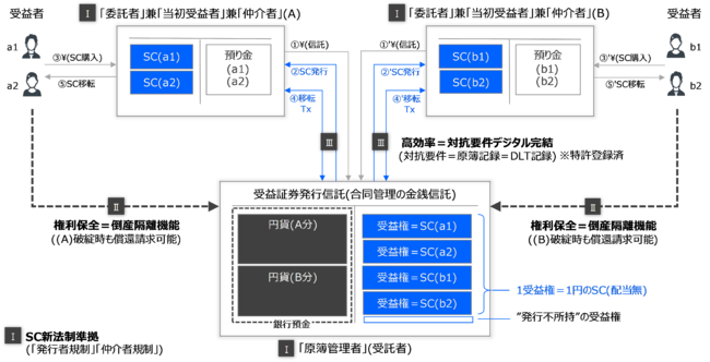 高い効率性:対抗要件問題く、デジタル完結でSCの転々流通が可能(ブロックチェーン更新を受益権原簿記録とする仕組みで特許登録済み)