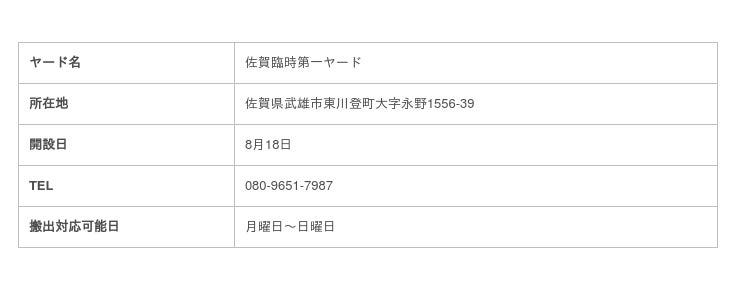 株式会社はなまる(以下当社)は、8月16日に九州北部の大雨の被害地域に対し災害復興支援チームを発足しました。常設車輌管理センター2か所での対応に加え、上記の臨時ヤードを開設し、復興支援にあたっています。