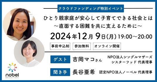 認定NPO法人ノーベル(本社:大阪市中央区、代表理事:高 亜希、以下:ノーベル)は、2024年12月9日(月)にNPO法人シングルマザーズシスターフッド(本社:東京都国立市、代表理事:吉岡マコ)の吉岡マコ氏を招き、オンラインにて講演会を開催いたします。