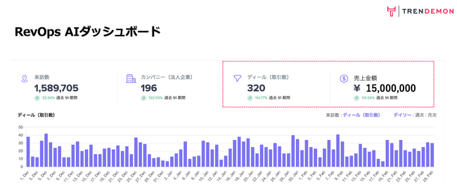 そこで、この度TRENDEMONではAPI連携によりSalesforce、Hubspot上のアカウント売上データをTRENDEMON上のデータと自動照合することで、どのマーケ施策によってどのくらいの売上貢献が生まれているのか誰でも簡単に可視化することが可能になる『RevOps AIダッシュボード』を本格的に提供開始致しました。