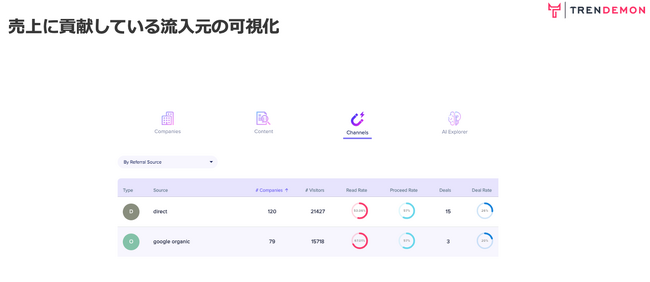 本機能では「コンテンツごとの売上貢献金額」、「売上貢献の高い流入元」「施策ごとの売上貢献」の可視化にとどまらず、AIが購買企業のジャーニーインサイトまでを自動的にサジェスト分析し、アノニマス来訪から受注に至るまでに必要な購買ステージごとのエンゲージメントインサイトを提供致します。