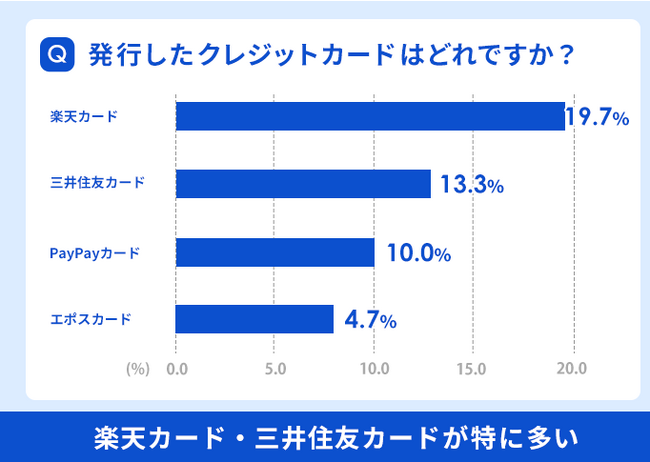 多くのクレジットカードの中で発行した数が最多だったのは、『楽天カード』(19.7%)でした。