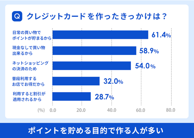 クレジットカードを作るきっかけは『日常の買い物でポイントが貯まるから』(61.4%)と回答した人が最も多い結果となりました。