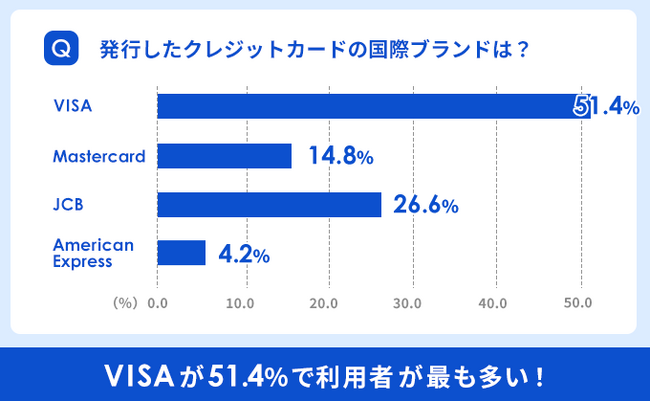 国内で利用されている国際ブランドでVISAに続いて『JCB』(26.6%)・『Mastercard』(14.8%)という結果に。