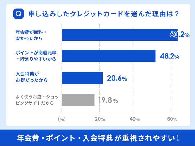 他にも『ポイントが高還元率・貯まりやすいから』(48.2%)、『入会特典がお得だったから』(20.6%)、『よく使うお店・ショッピングサイトだから』(19.8%)という結果でした。