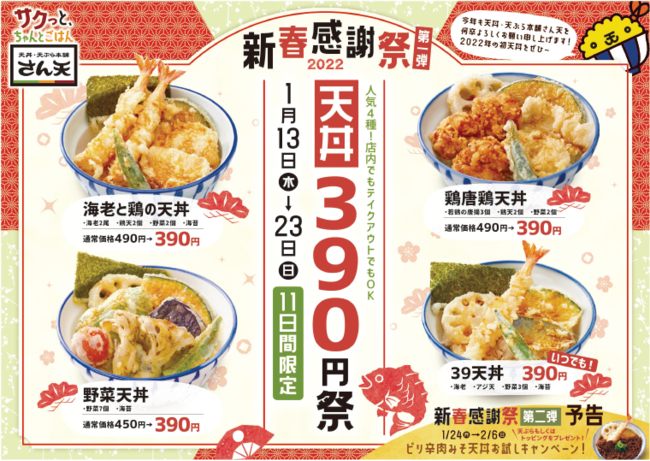 【天丼・天ぷら本舗 さん天】が1月13日(木)から新春感謝祭第1弾≪天丼390円祭≫を開催!1月24日(月)から新春感謝祭第2弾≪ピリ辛肉みそ天丼お試しキャンペーン≫を開催!