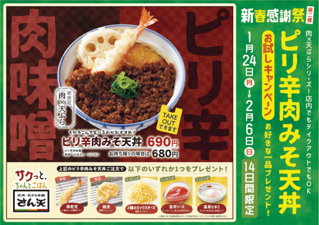 新春感謝祭第2弾は1月24日(月)から、【ピリ辛肉みそ天丼お試しキャンペーン】を開催します。