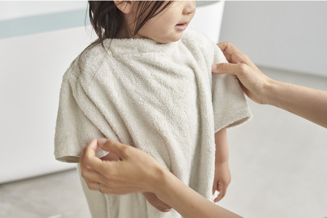 何にでも興味を持って動きまわる、元気いっぱいで目を離せない子どものために、ふわっと簡単に着せられる「kids bath wear」ができました。2021年7月に発売した「h tag」の人気製品、肌を傷つけない特殊糸で作られた「bath towel(バスタオル)」の生地をベースに、着衣に適した「kids bath wear」専用生地を開発。低刺激なふわふわ感をそのままに、入浴後のデリケートなお子さまの肌をやさしく包み込みます。