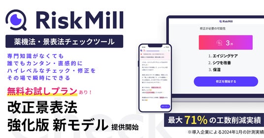 AIを活用した薬機法・景表法チェックツール「RiskMill(リスクミル)薬機法チェックツール」(以下、「RiskMill」)を提供する株式会社Crew(代表取締役:柳澤龍一、本社:東京都渋谷区)は、2024年10月1日より改正景品表示法(「不当景品類及び不当表示防止法」)が施行されたことを受け、「RiskMill」を共同開発し運営する、株式会社サイバー・バズと共同開催の無料ウェビナーを10月10日(木)に開催しました。この度、アンケート回答者の満足度が94.4%と好評をいただいたことを受け、10月24日(木)、25日(金)に追加開催することを決定しました。改正景品表示法について基礎から変更点、対策について事例を用いながらわかりやすく解説いたします。