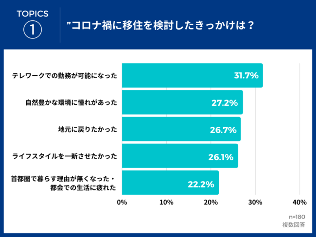 きっかけは、「テレワークでの勤務が可能になった」ことが最も多く、「自然豊かな環境に憧れがあった」が次に多い結果に。
