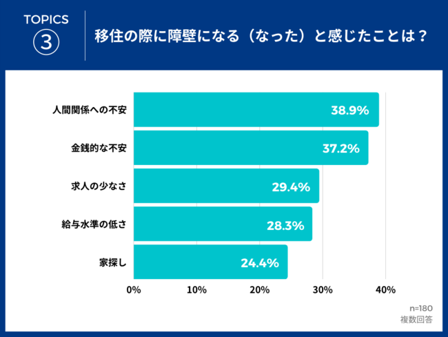 移住の障壁として最も多くの人が抱えるのは「人間関係への不安」。次に多いのは「金銭的な不安」という結果となりました。