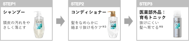包括的に「抜け毛」をケアするために3つのステップを揃えました。 シャンプー、コンディショナーには、植物幹細胞由来成分(リンゴ果実培養細胞エキス:保湿成分)を配合。頭皮をやさしく洗浄し、髪をなめらかにすることで絡まり抜け毛を防ぎます※3 。さらに、育毛効果のあるトニックで抜けにくい髪へ育てます※4 。