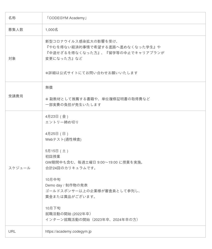 「CODEGYM Academy」は、新型コロナウイルス感染拡大の影響を受けて、やむを得ない経済的事情で希望する進路へ進めなくなった学生や、中退せざるを得なくなった方、留学等の中止でキャリアプランが変更になった方などの中から最大1000名を対象に、オンラインにて無償でプログラミング学習を提供する支援プロジェクトです。