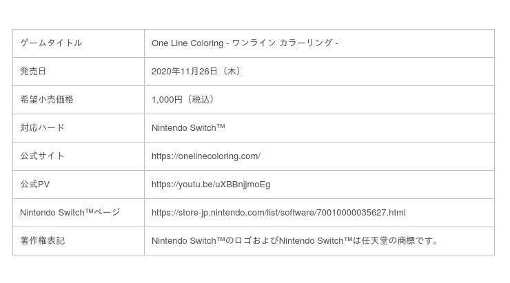 『One Line Coloring - ワンライン カラーリング -』は、本日11月12日(木)よりニンテンドーeショップにて予約販売を開始し、11月26日(木)にダウンロード版タイトルが発売となります。本作の詳細情報は、『One Line Coloring - ワンライン カラーリング -』公式サイト(https://onelinecoloring.com/)をご覧ください。
